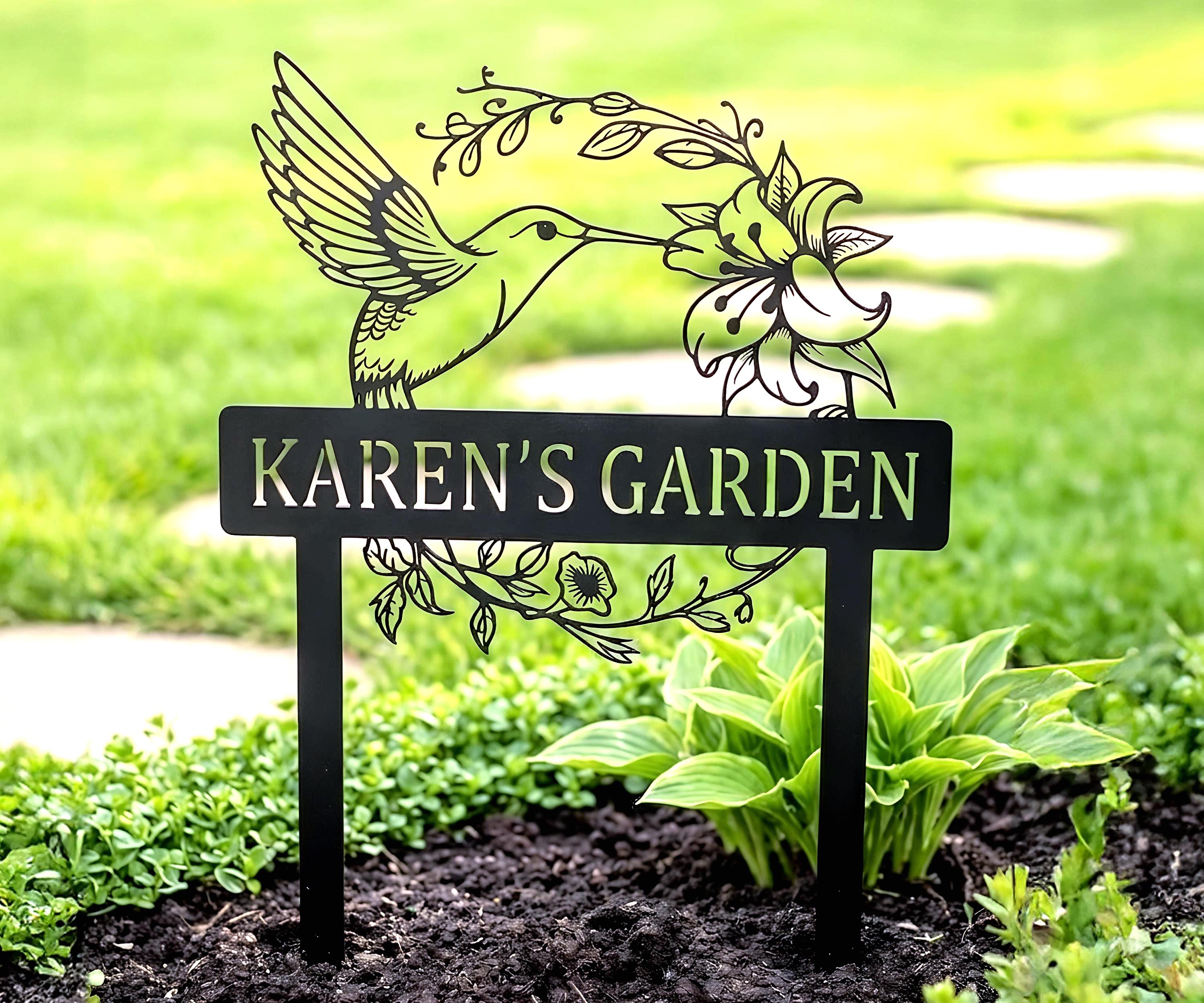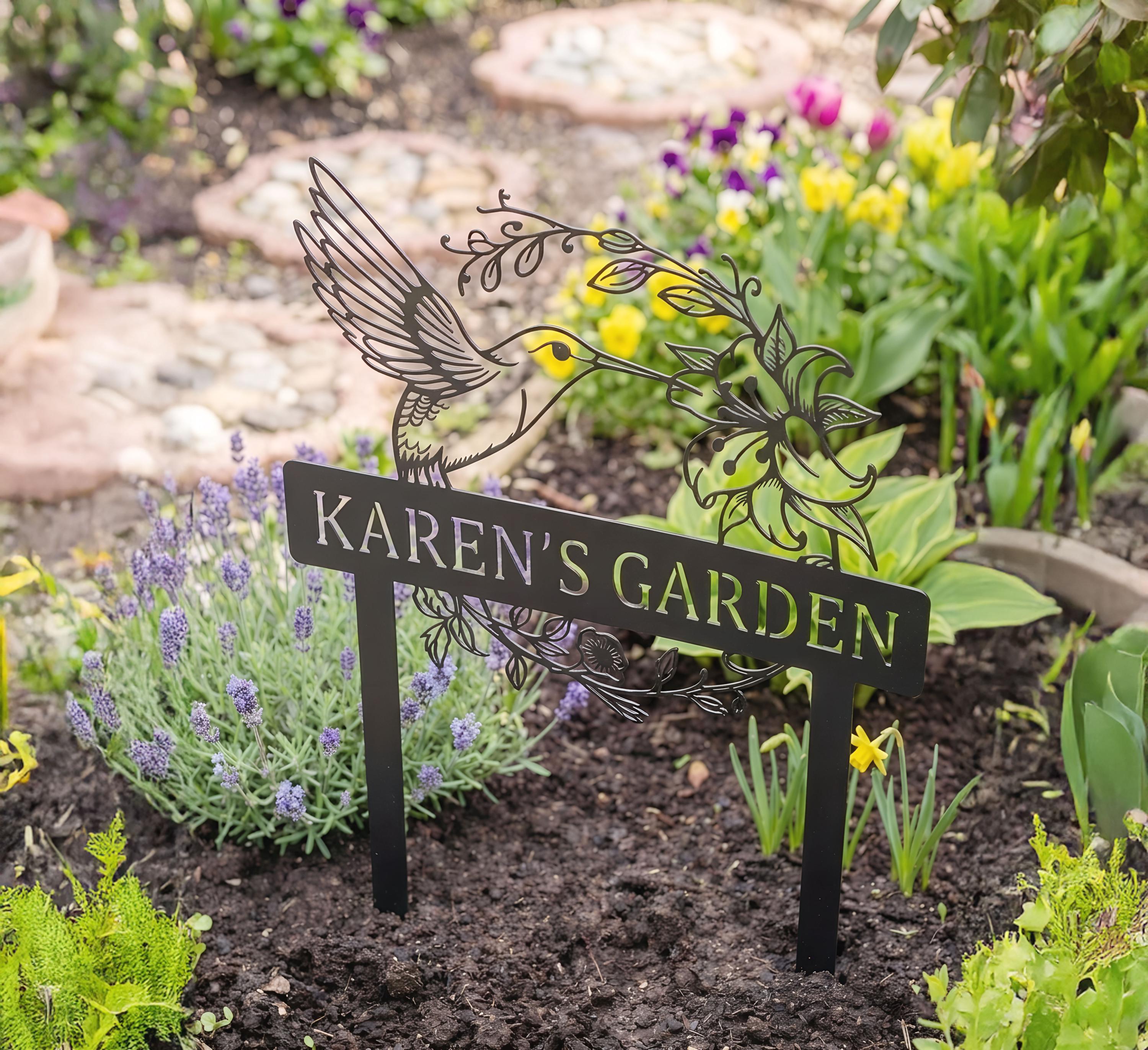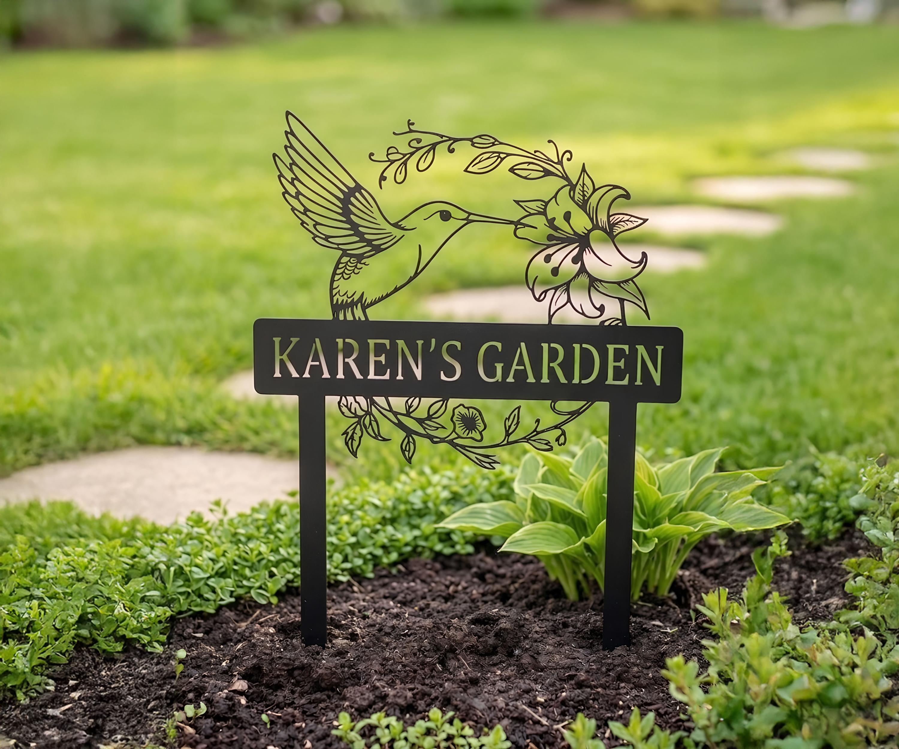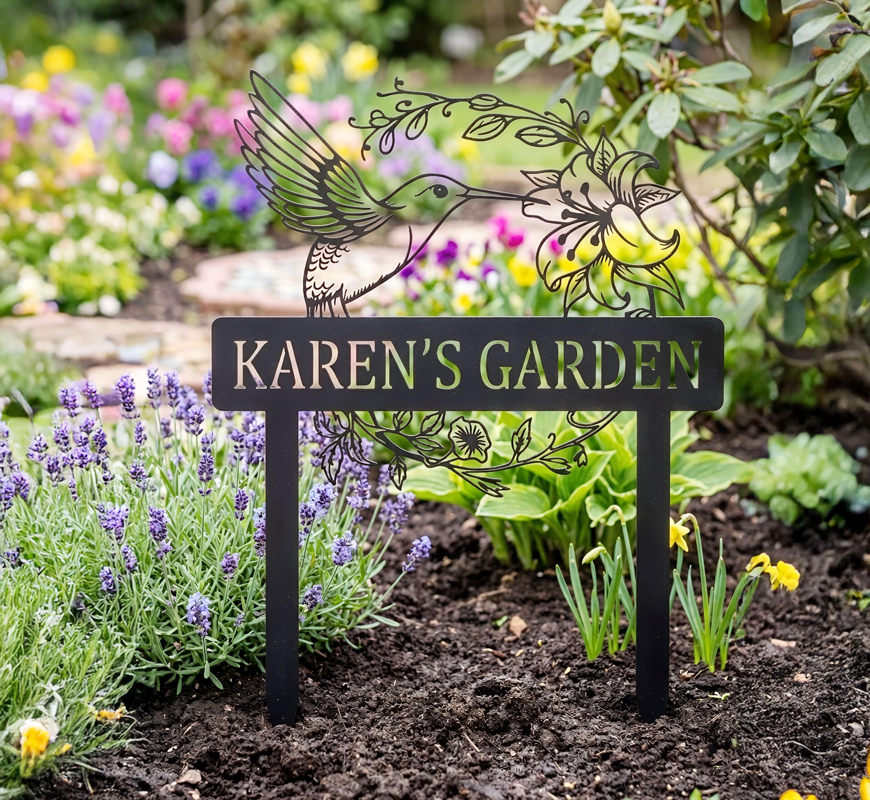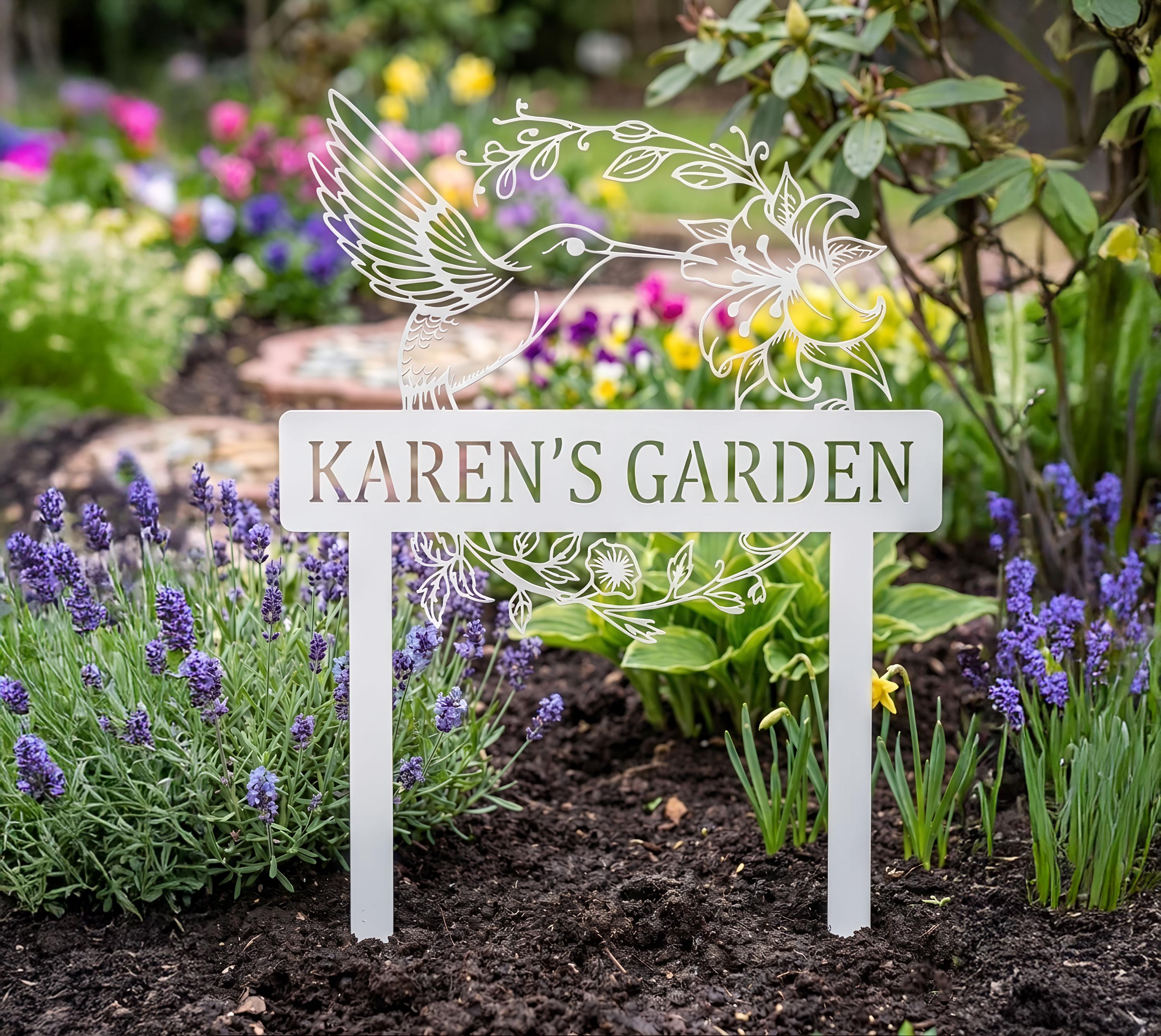Add a personal touch to your outdoor space with this elegant hummingbird garden sign. Crafted with a detailed floral design, this custom metal stake features your chosen name, making it a perfect decoration for gardens, yards, or patios. Durable and weather-resistant, it’s ideal for year-round outdoor use. A thoughtful gift for gardeners, nature lovers, housewarmings, birthdays, or Mother’s Day. Easy to install and designed to stand out beautifully among your plants.
