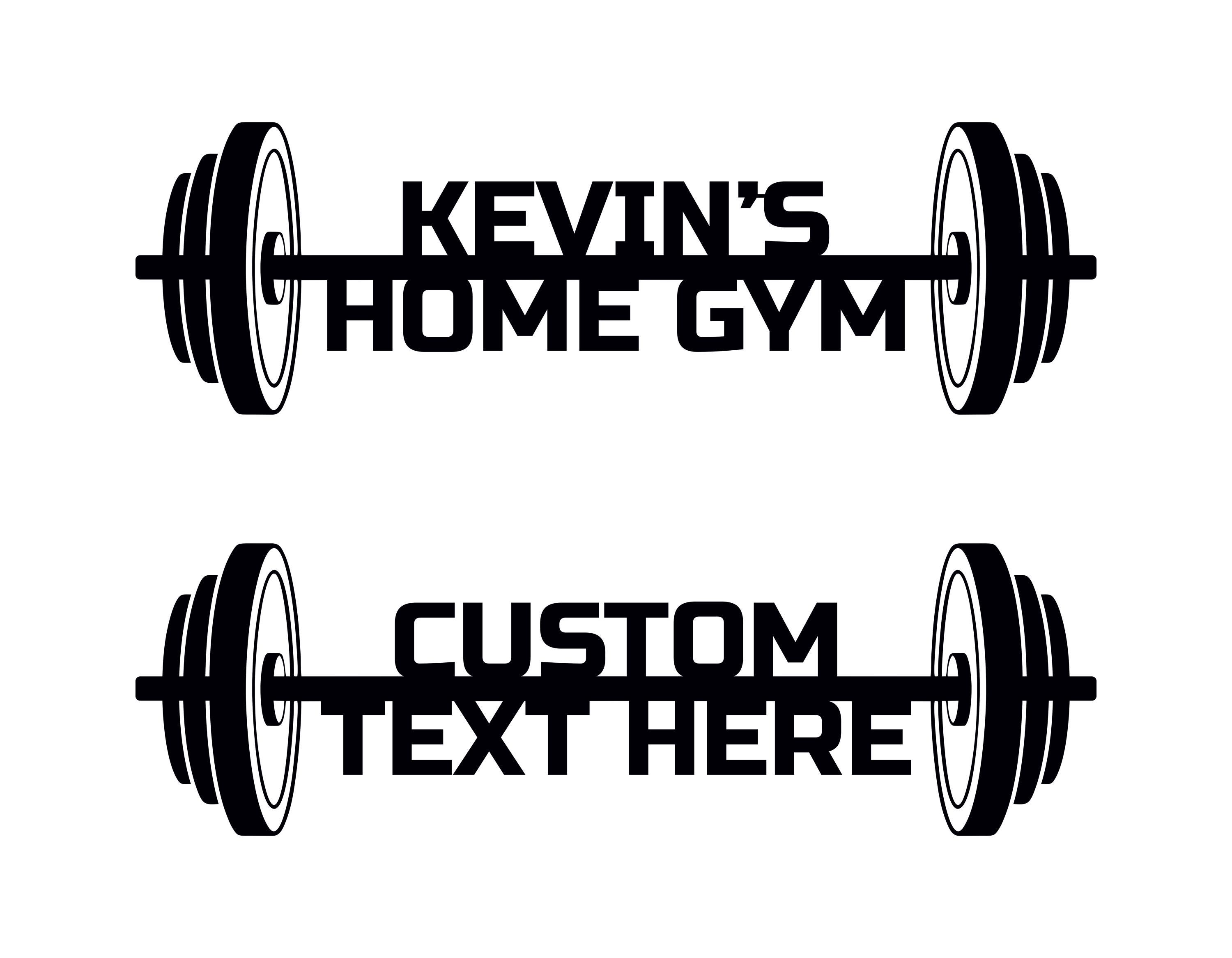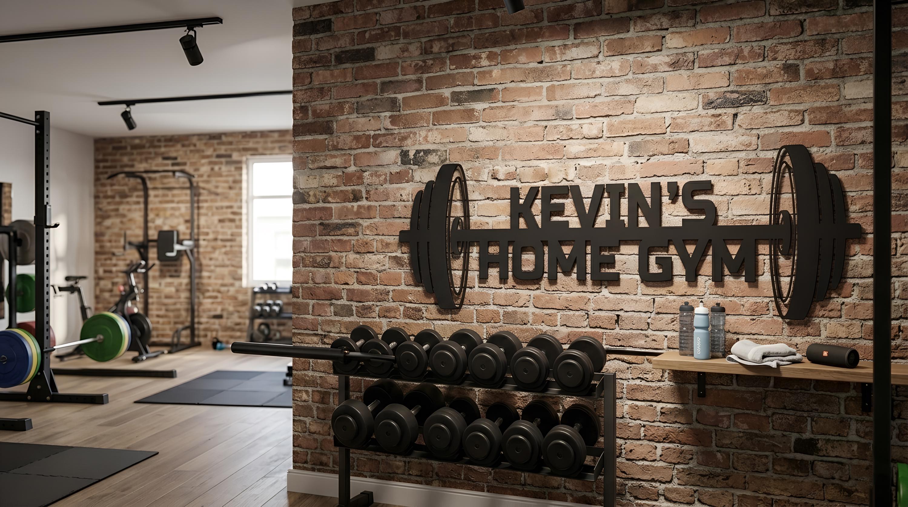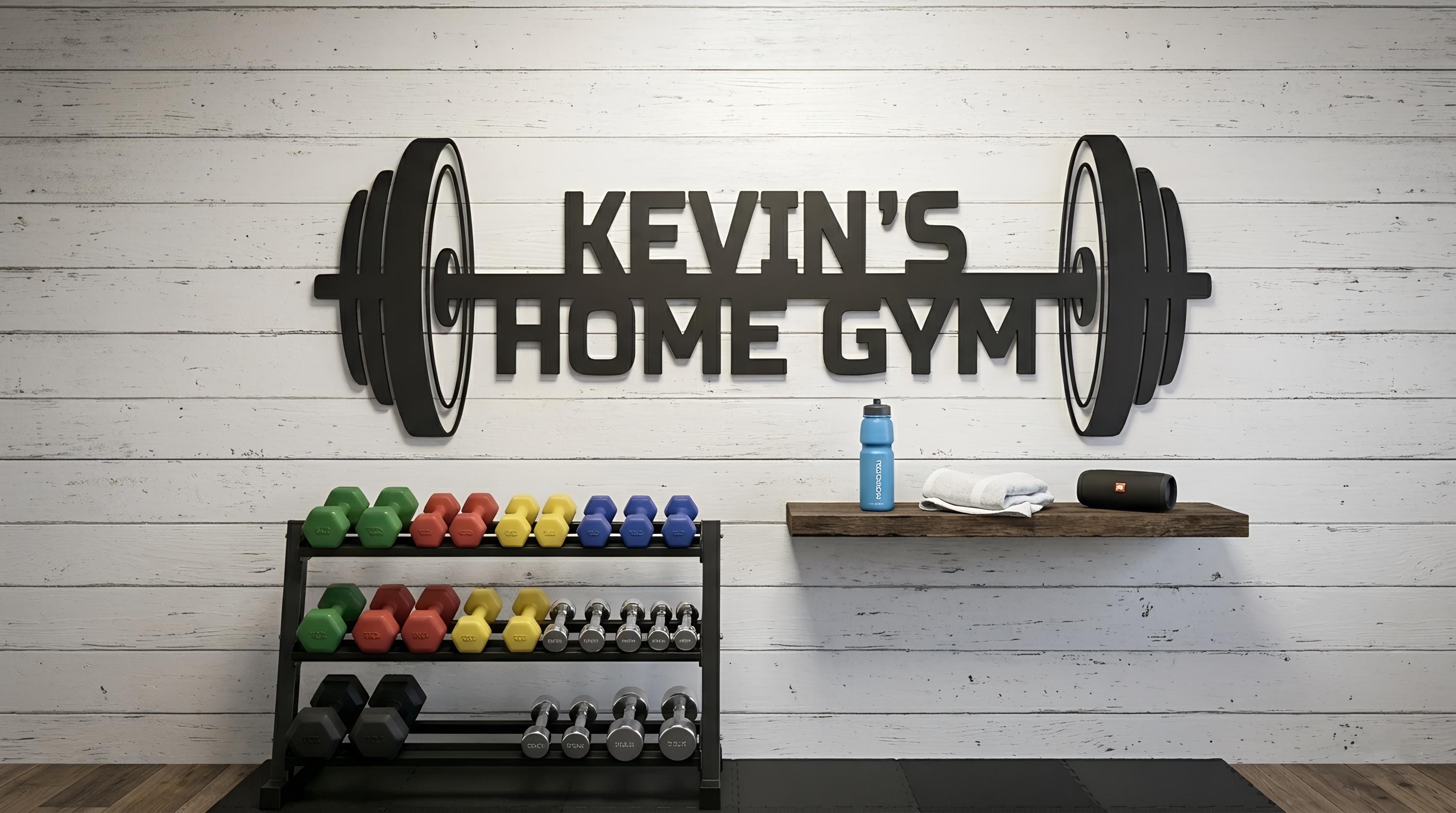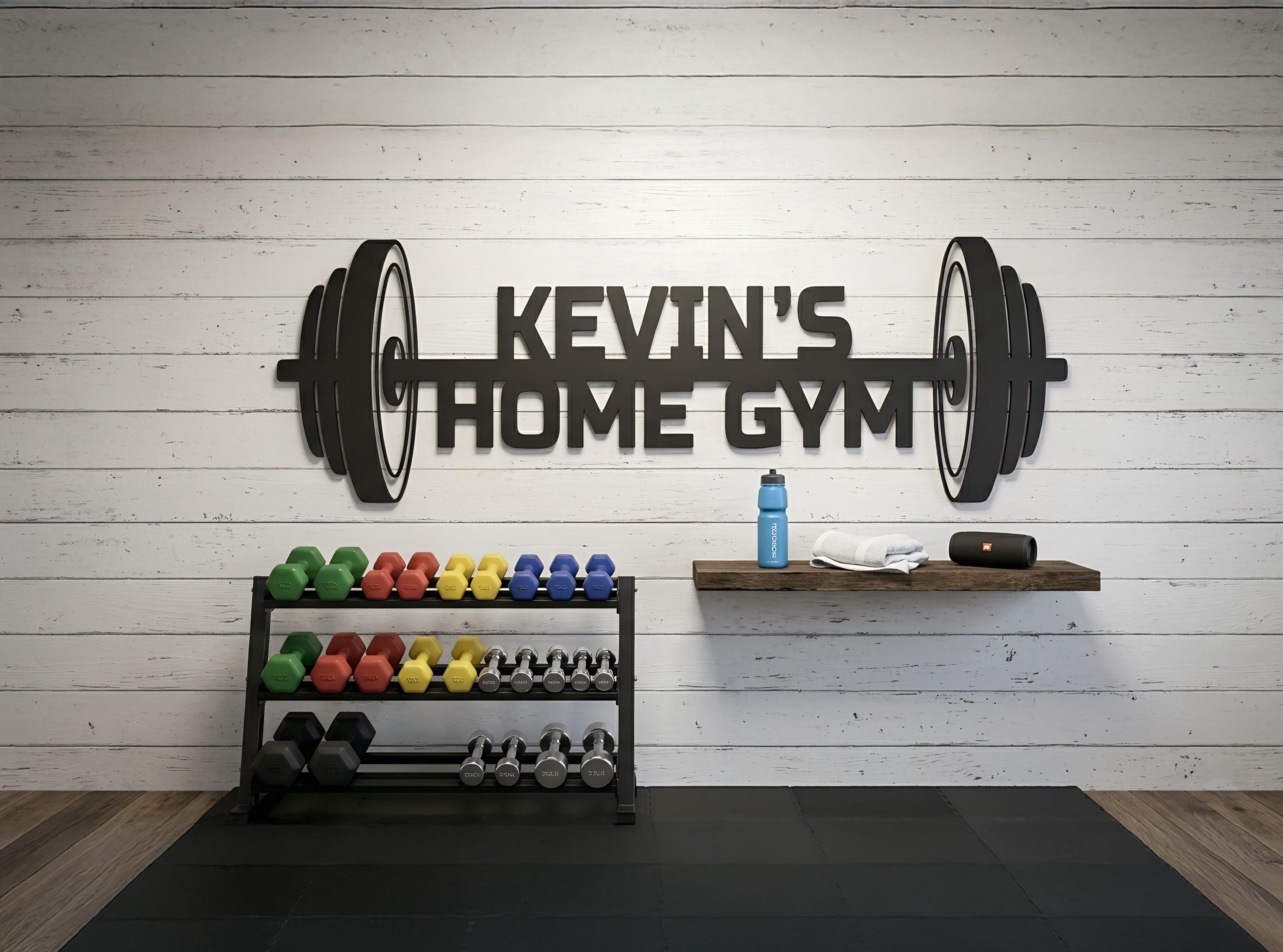 Turn your gym into a personal space with a custom metal barbell sign featuring your name.